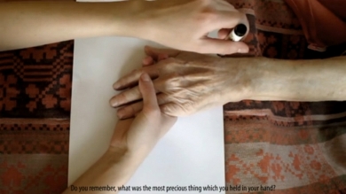 Wnuczka zadaje dziadkowi pytania. Wszystkie wiążą się z jego dłonią, którą trzyma w ręku.